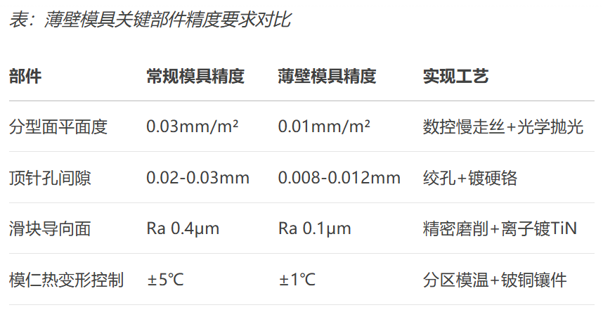 -熱變形疊加:薄壁模具因模仁纖細更易熱膨脹。若模溫180℃時局部溫差30℃,100mm鋼模仁長度變化達0.3mm,直接破壞分型面貼合。
